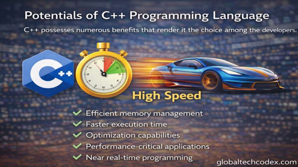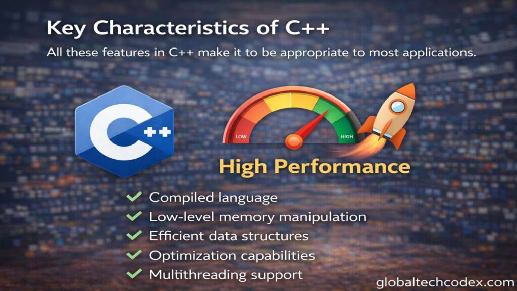C++ programs are also typified by high-performance speed hence are applicable in applications requiring high-performance.