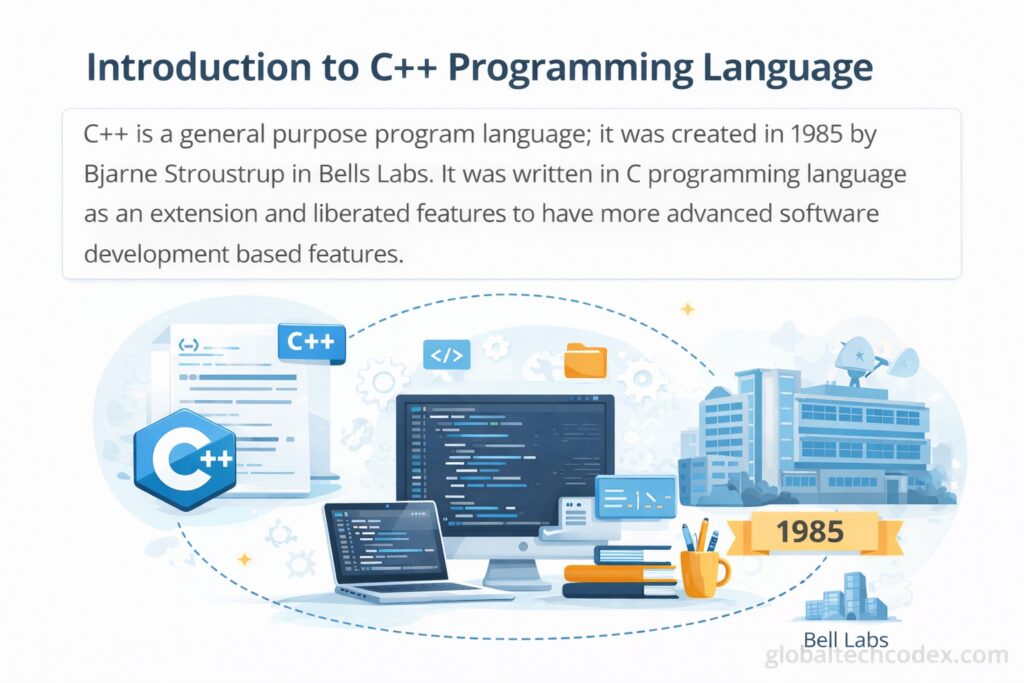C++ is a general purpose program language; it was created in 1985 by Bjarne Stroustrup in Bells Labs. It was written in C programming language as an extension and liberated features to have more advanced software development based features.