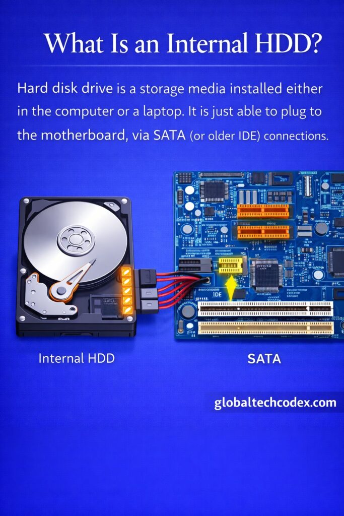 Hard disk drive is a storage media installed either in the computer or a laptop. It is just able to plug to the motherboard, via SATA (or older IDE) connections.