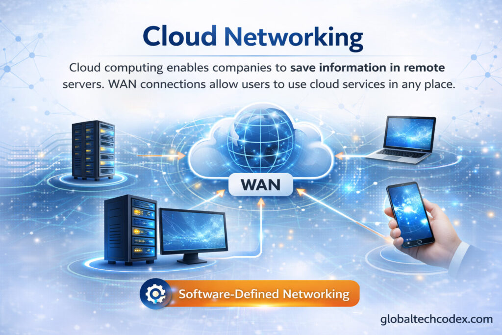 Cloud computing enables companies to save information in remote servers. WAN connections allow users to use cloud services in any place.