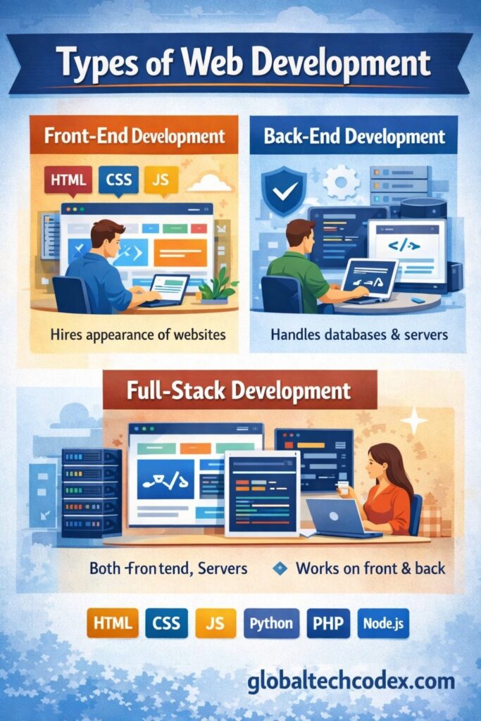 Web development is of three major types. Front-end development is concerned with how the users view the screen, i.e. layout, colors, fonts, buttons, and menus. It mostly employs HTML, CSS, and JavaScript. Back-end development is a certain type of development that the team works behind the scenes, which includes databases, servers, and user login systems as well as front-end development in languages such as Python, PHP, Java, or Node.js. Full-stack development is a type of development that enables developers to create websites to the point of completion, including databases, servers and system of user logins.