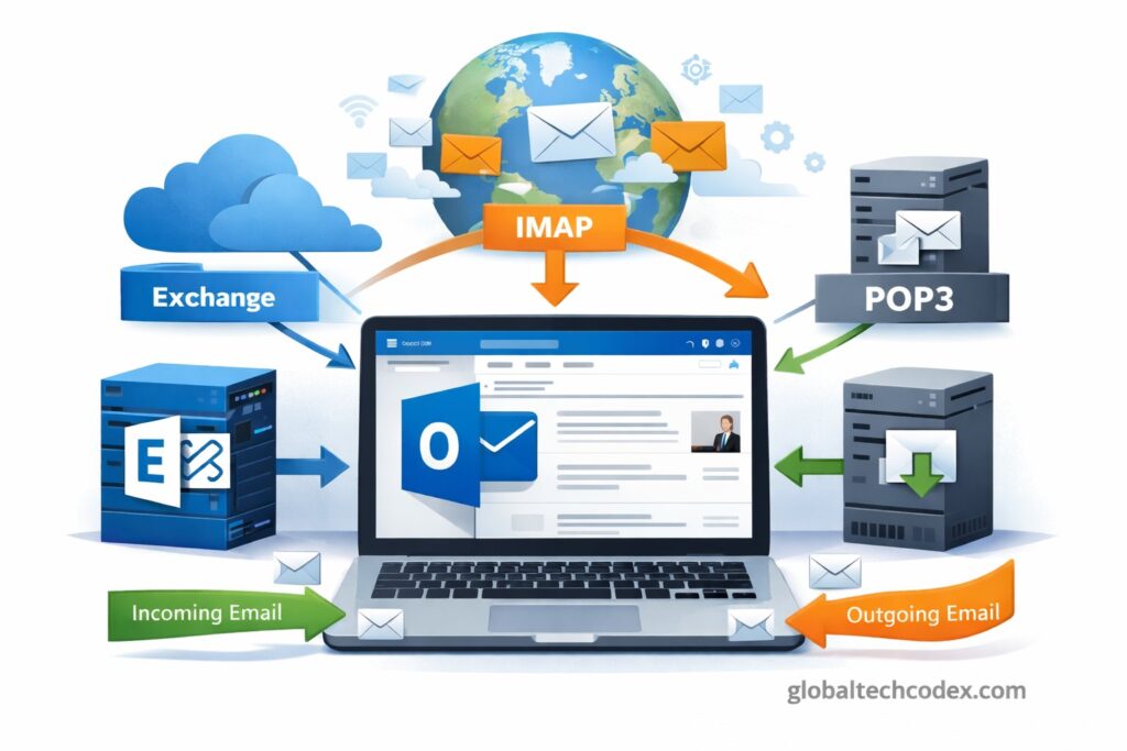 Outlook has the ability to communicate with email servers including Microsoft exchange, IMAP and POP3 to forward and receive messages. When connected, it downloads and sort emails into its different folders such as Inbox, Sent, Drafts and Spam.