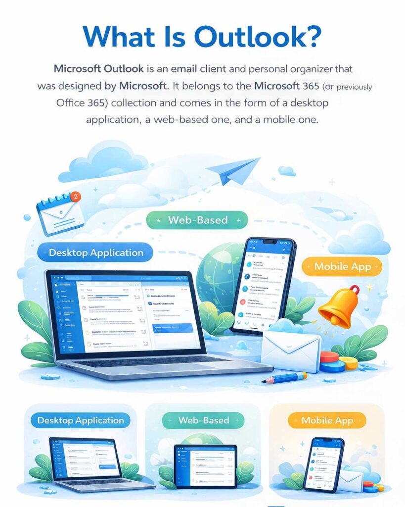 Microsoft outlook is an email client and personal organizer that was designed by Microsoft. It belongs to the Microsoft 365 (or previously Office 365) collection and comes in the form of a desktop application, a web-based one, and a mobile one.